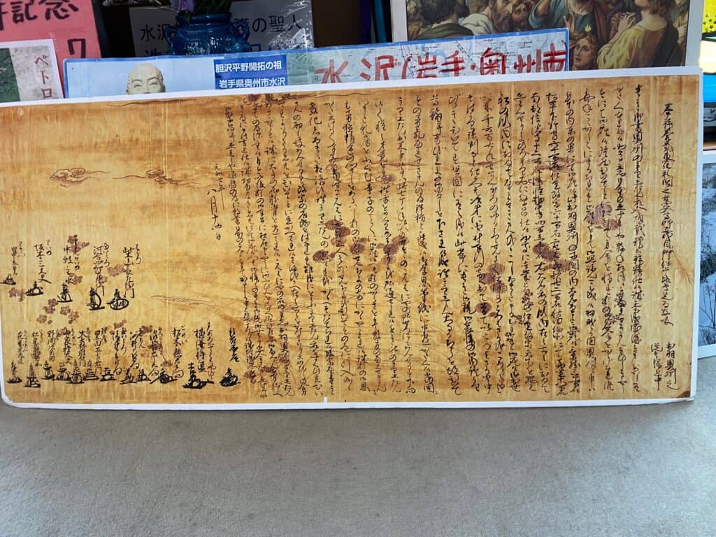 キリシタン時代、教会の状態や迫害などの詳細な報告がバチカンに届きました。教皇をはじめ教会は日本の教会のために祈ってくれました。そして、教皇ウルバヌス8世は1623年の聖年を前倒しして、日本のキリシタンたちに心のこもった励ましの手紙と聖年に伴う「免償」の恵みを送ってくださいました。教皇の手紙は日本語に数部翻訳され、日本各地のキリシタンにひそかに送られました。迫害の中のキリシタンたちはどれほど感激したでしょうか。各地でキリシタンの代表者たちが連名で感謝の手紙を書き、教皇に送りました。私は岩手県の水沢教会でキリシタン武将後藤壽庵はじめ17名の手紙の写しを見ました。その写真です。